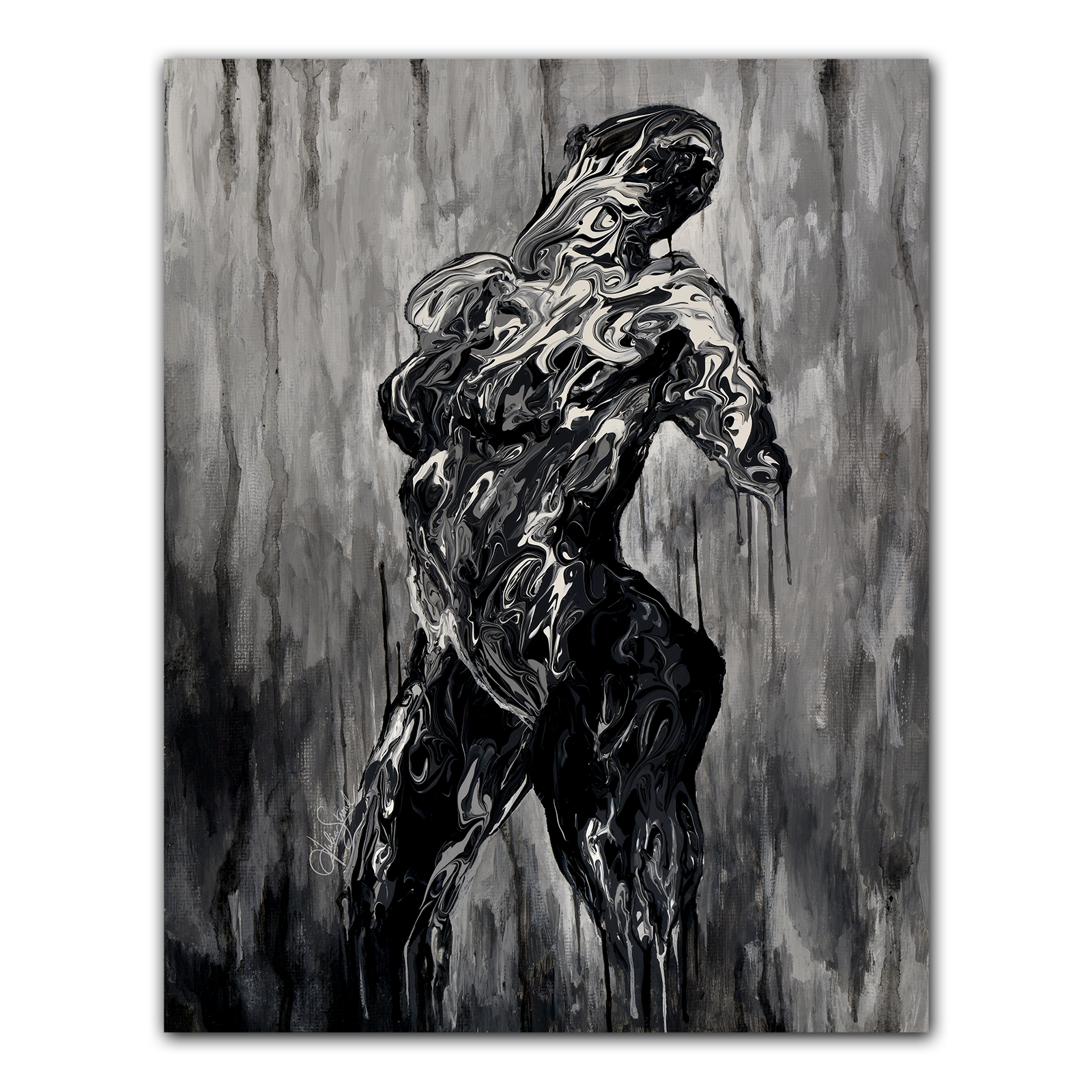 At the meeting point between aspiration and reality, we find the strength it takes to forge a path through uncertainty, becoming the person we need to be to face life’s trials. Black, white, and gray swirl together, forming a central figure that seems to emerge from the chaos.