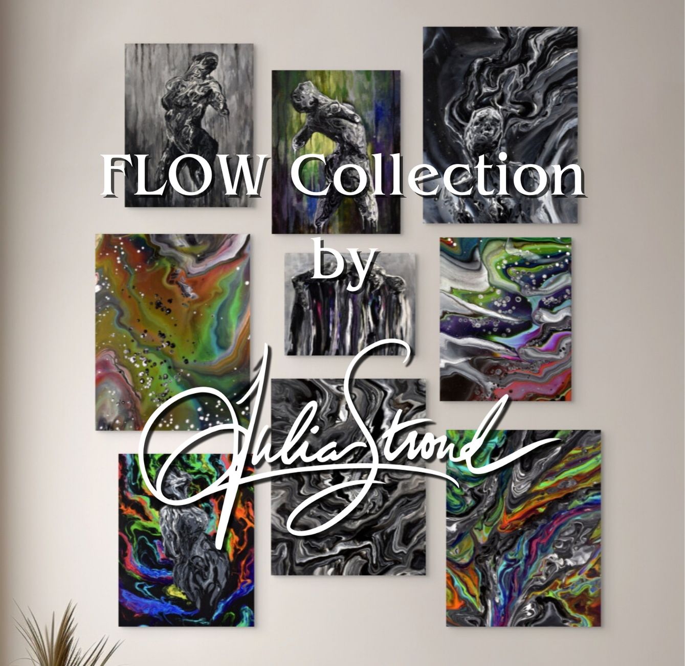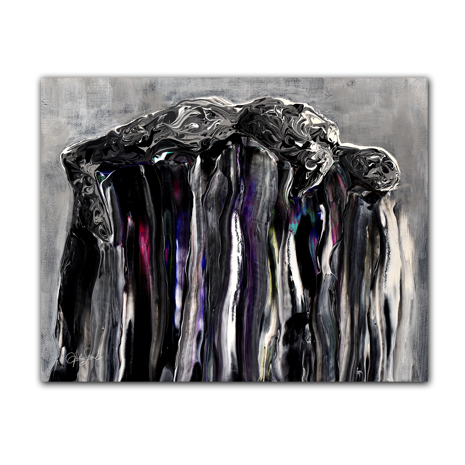 In our need for stillness, we seek the quiet reprieve between life’s upheavals—a time to rest and regain strength before the next chapter. A fluid figure rests at the canvas’s edge, as if caught between sinking and being held aloft by cascading lines of black, white, and vibrant hues.